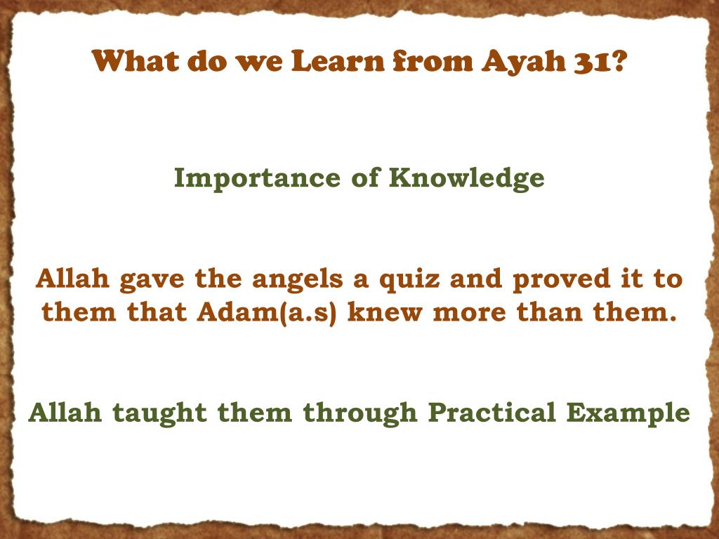 What do we Learn from Ayah 31? Importance of Knowledge Allah gave the angels a quiz and proved it to them that Adam(a.s) knew more than them. Allah taught them through Practical Example