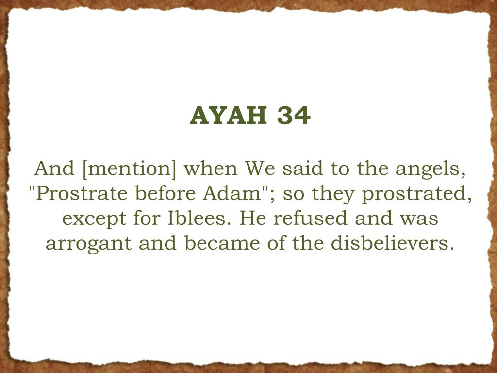 AYAH 34 And [mention] when We said to the angels, "Prostrate before Adam"; so they prostrated, except for Iblees. He refused and was arrogant and became of the disbelievers.