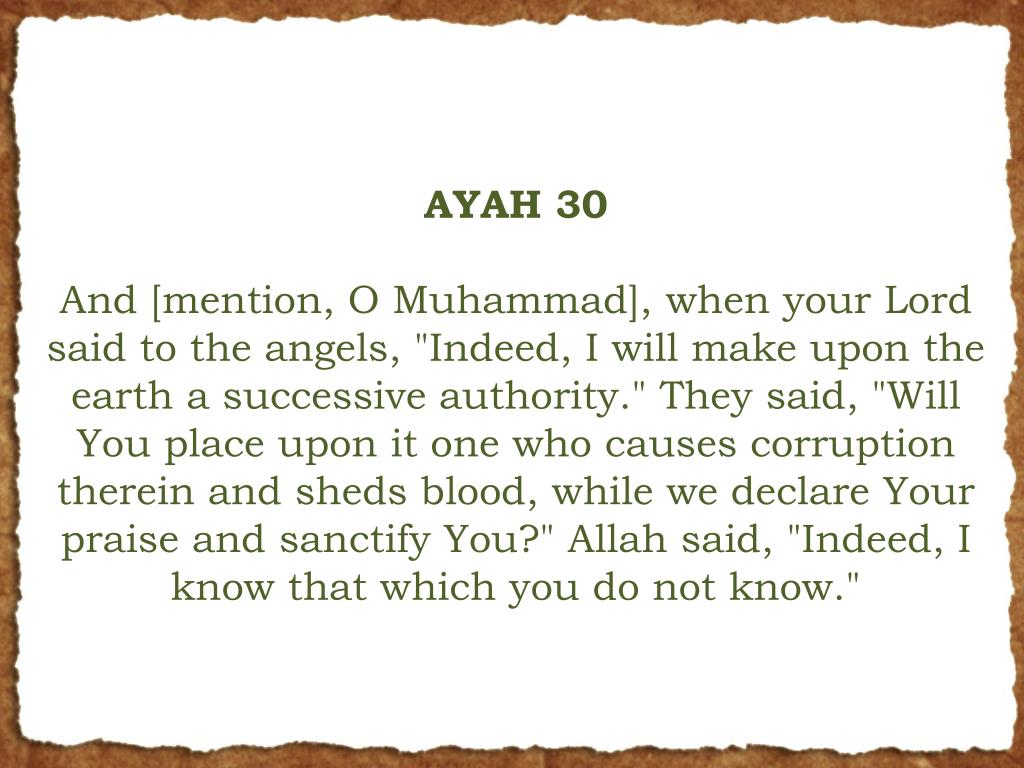 AYAH 30 And [mention, O Muhammad], when your Lord said to the angels, "Indeed, I will make upon the earth a successive authority." They said, "Will You place upon it one who causes corruption therein and sheds blood, while we declare Your praise and sanctify You?" Allah said, "Indeed, I know that which you do not know."