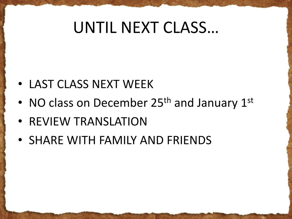 UNTIL NEXT CLASS… • LAST CLASS NEXT WEEK • NO class on December 25th and January 1st • REVIEW TRANSLATION • SHARE WITH FAMILY AND FRIENDS