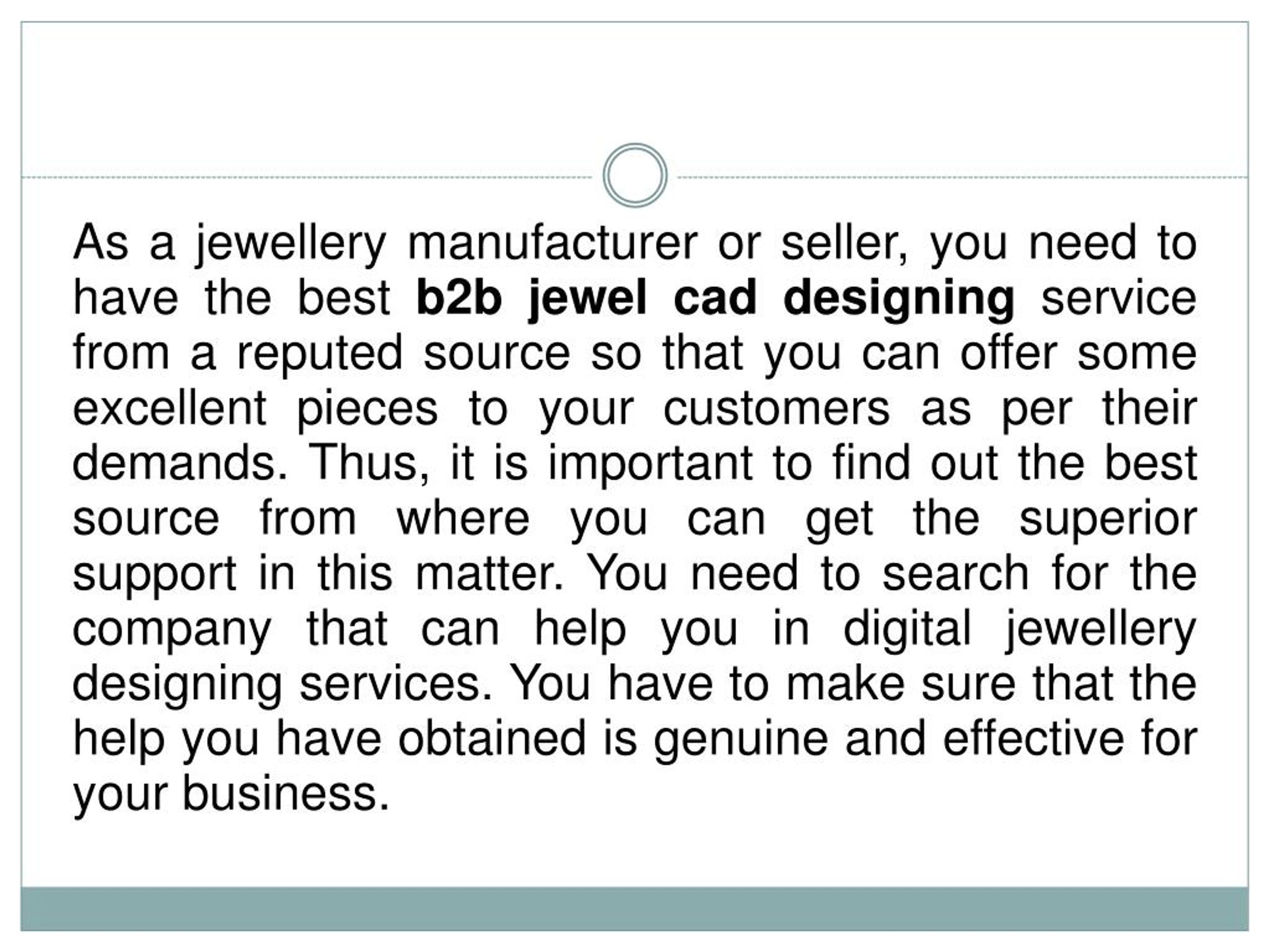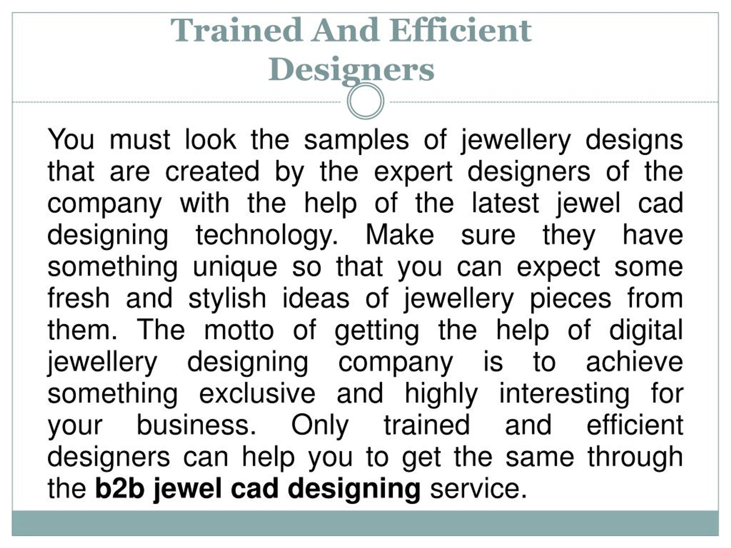Trained And Efficient Designers You must look the samples of jewellery designs that are created by the expert designers of the company with the help of the latest jewel cad designing technology. Make sure they have something unique so that you can expect some fresh and stylish ideas of jewellery pieces from them. The motto of getting the help of digital jewellery designing company is to achieve something exclusive and highly interesting for your business. Only designers can help you to get the same through the b2b jewel cad designing service. trained and efficient