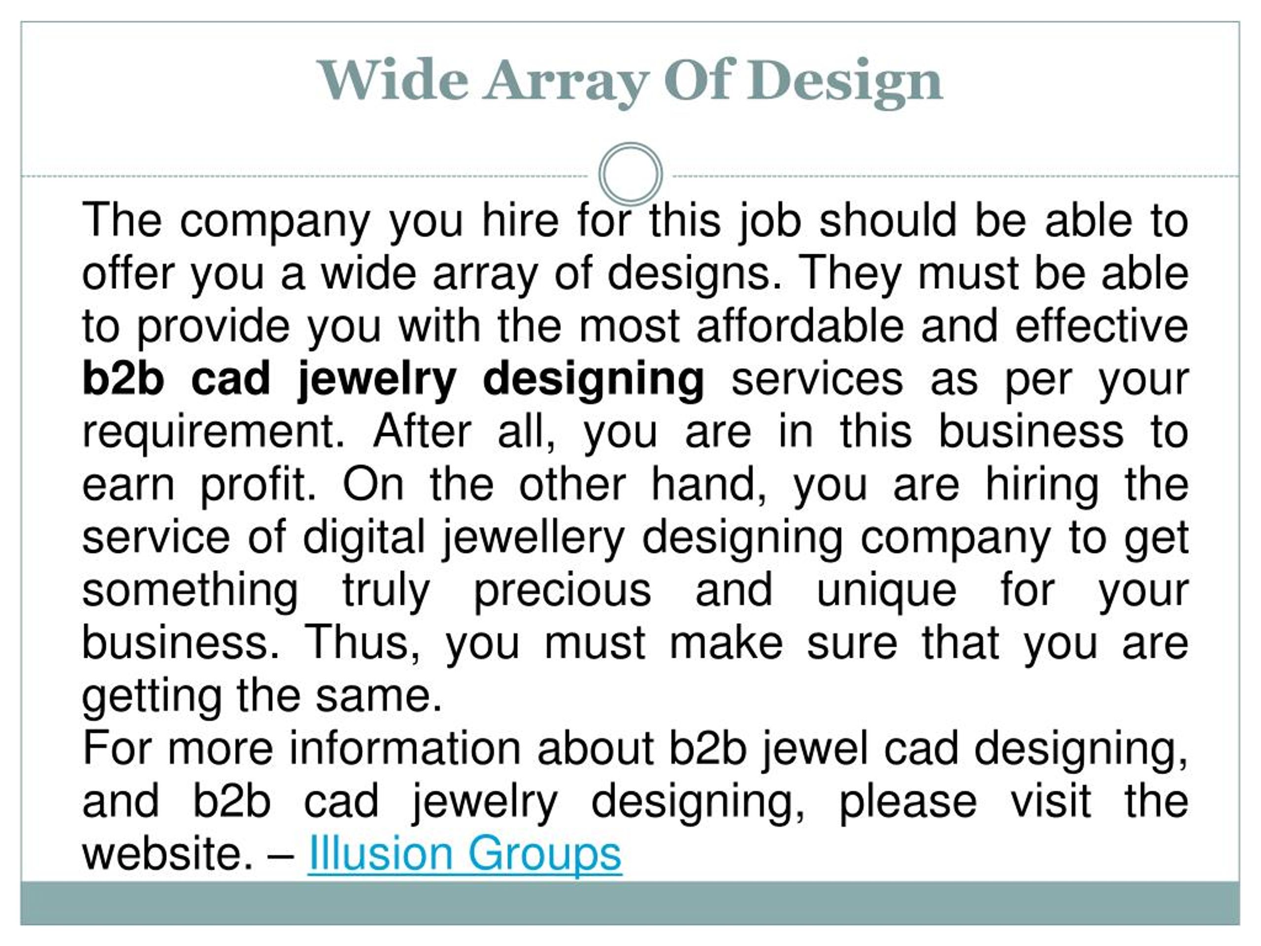 Wide Array Of Design The company you hire for this job should be able to offer you a wide array of designs. They must be able to provide you with the most affordable and effective b2b cad jewelry designing services as per your requirement. After all, you are in this business to earn profit. On the other hand, you are hiring the service of digital jewellery designing company to get something truly precious and unique for your business. Thus, you must make sure that you are getting the same. For more information about b2b jewel cad designing, and b2b cad jewelry designing, please visit the website. – Illusion Groups