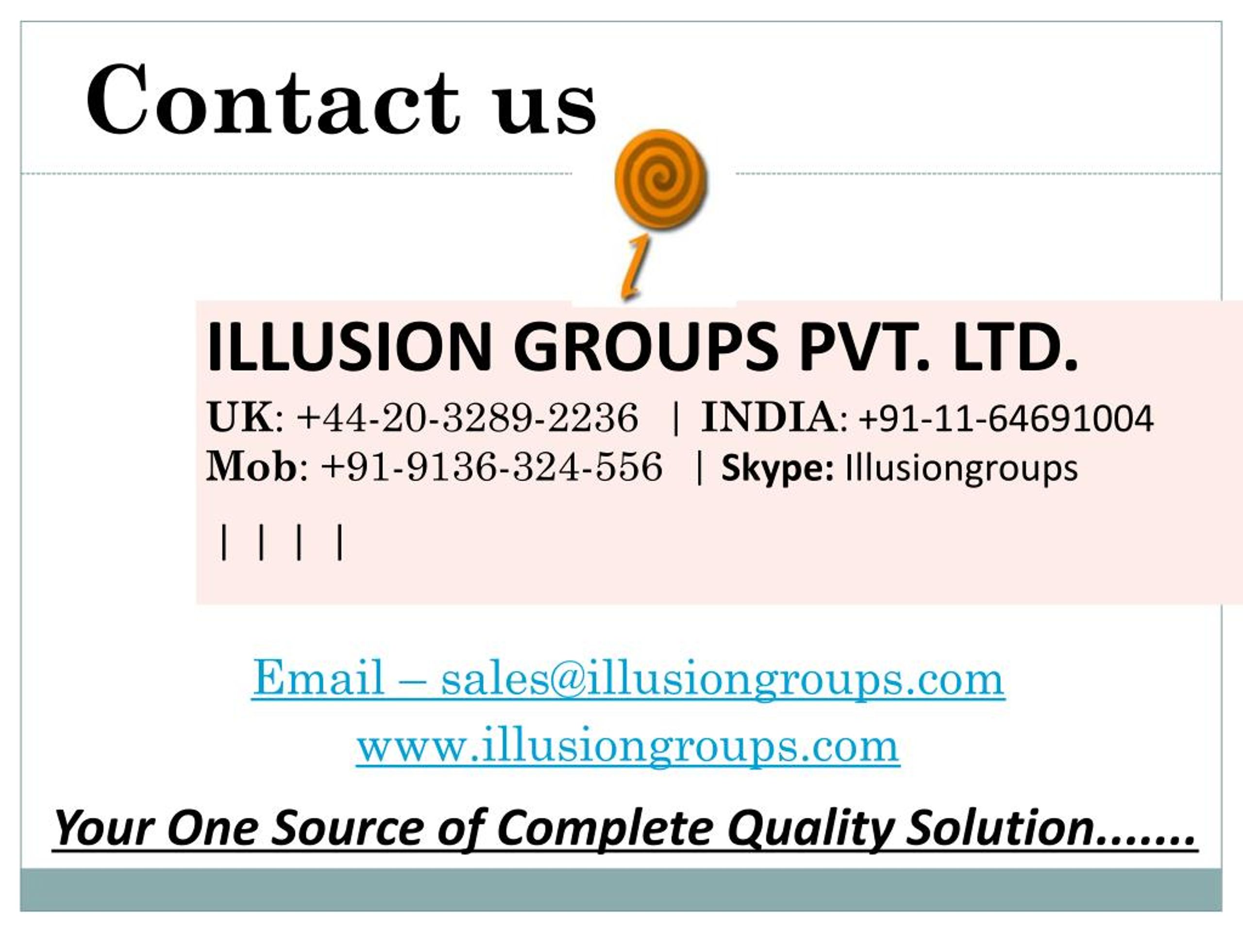 Contact us ILLUSION GROUPS PVT. LTD. UK: +44-20-3289-2236| INDIA: +91-11-64691004 Mob: +91-9136-324-556 |Skype: Illusiongroups | | | | Email – sales@illusiongroups.com www.illusiongroups.com Your One Source of Complete Quality Solution.......