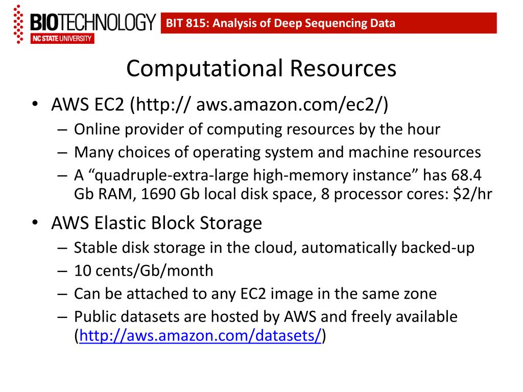 BIT 815: Analysis of Deep Sequencing Data Computational Resources • AWS EC2 (http:// aws.amazon.com/ec2/) • Online provider of computing resources by the hour • Many choices of operating system and machine resources • A “quadruple-extra-large high-memory instance” has 68.4 Gb RAM, 1690 Gb local disk space, 8 processor cores: $2/hr • AWS Elastic Block Storage • Stable disk storage in the cloud, automatically backed-up • 10 cents/Gb/month • Can be attached to any EC2 image in the same zone • Public datasets are hosted by AWS and freely available(http://aws.amazon.com/datasets/)