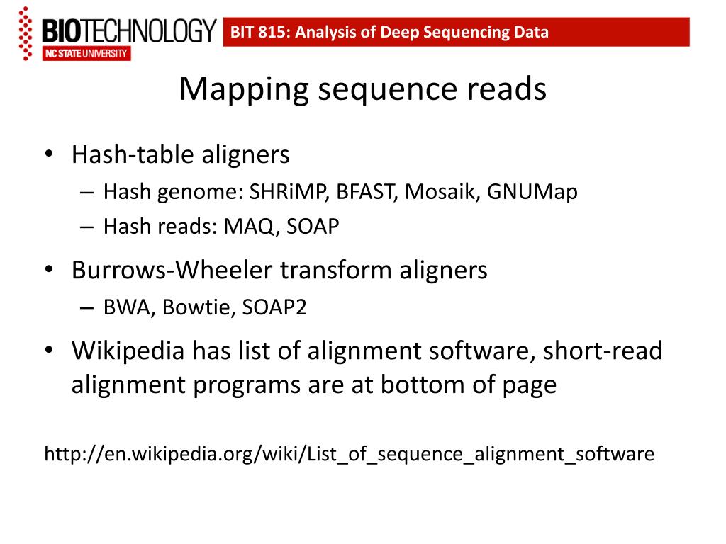 BIT 815: Analysis of Deep Sequencing Data Mapping sequence reads • Hash-table aligners • Hash genome: SHRiMP, BFAST, Mosaik, GNUMap • Hash reads: MAQ, SOAP • Burrows-Wheeler transform aligners • BWA, Bowtie, SOAP2 • Wikipedia has list of alignment software, short-read alignment programs are at bottom of page http://en.wikipedia.org/wiki/List_of_sequence_alignment_software