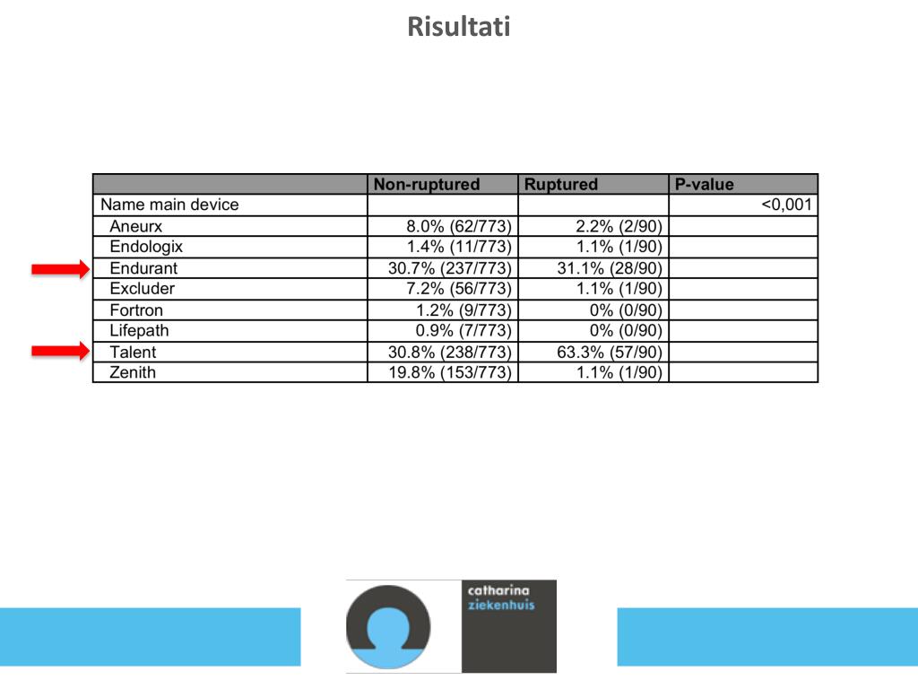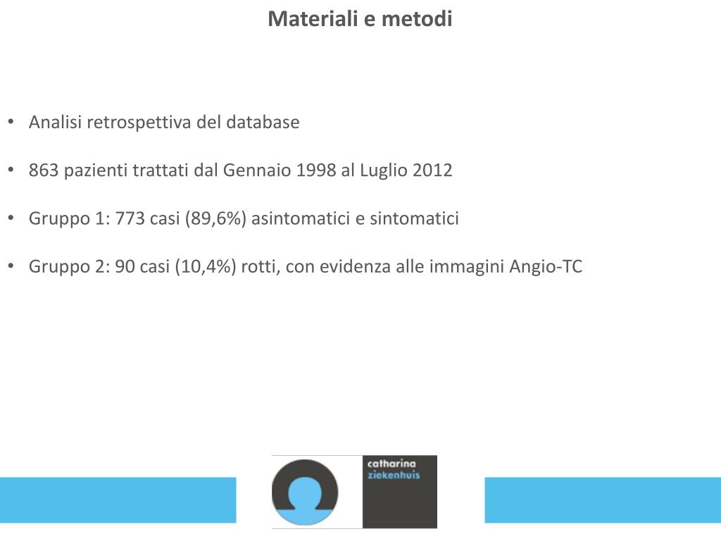 Materiali e metodi • Analisi retrospettiva del database • 863 pazienti trattati dal Gennaio 1998 al Luglio 2012 • Gruppo 1: 773 casi (89,6%) asintomatici e sintomatici • Gruppo 2: 90 casi (10,4%) rotti, con evidenza alle immagini Angio-TC