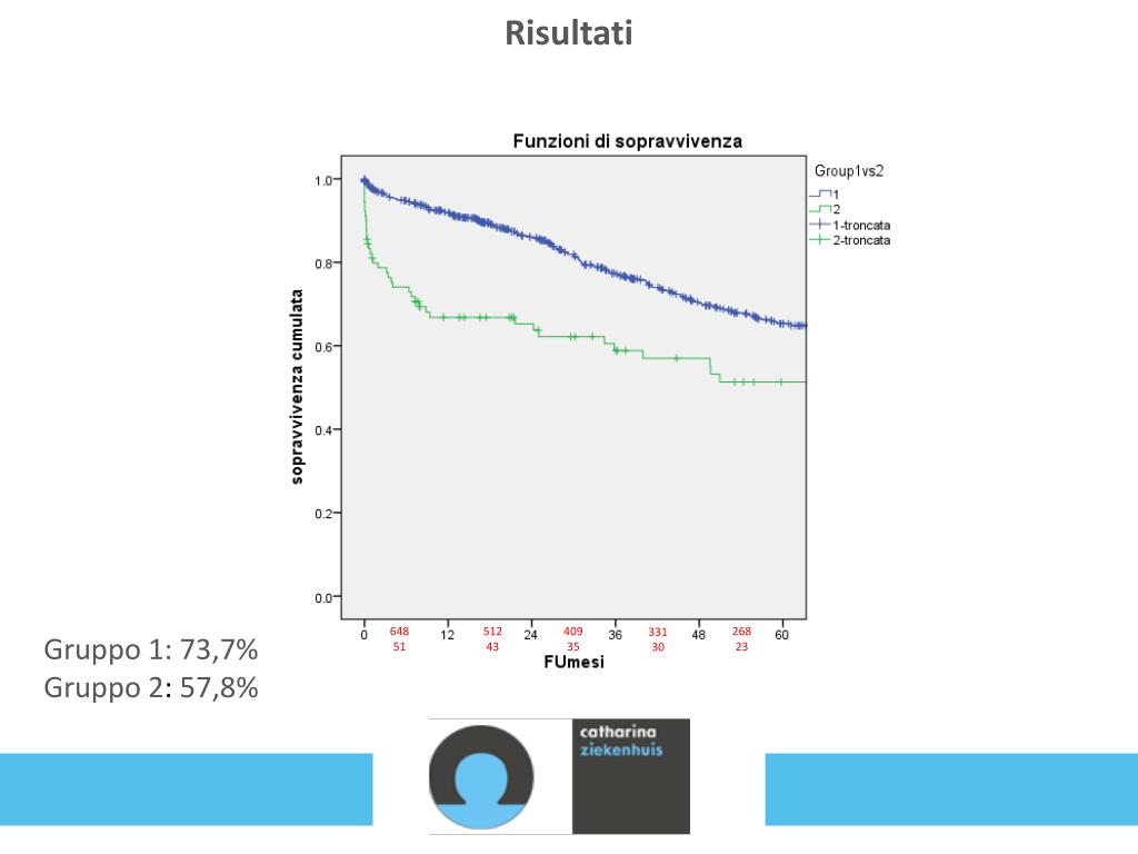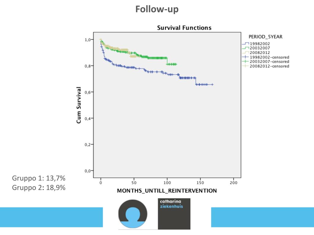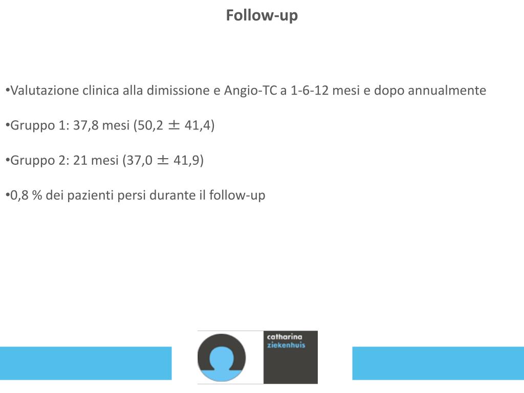 Follow-up • Valutazione clinica alla dimissione e Angio-TC a 1-6-12 mesi e dopo annualmente • Gruppo 1: 37,8 mesi (50,2 ± 41,4) • Gruppo 2: 21 mesi (37,0 ± 41,9) • 0,8 % dei pazienti persi durante il follow-up