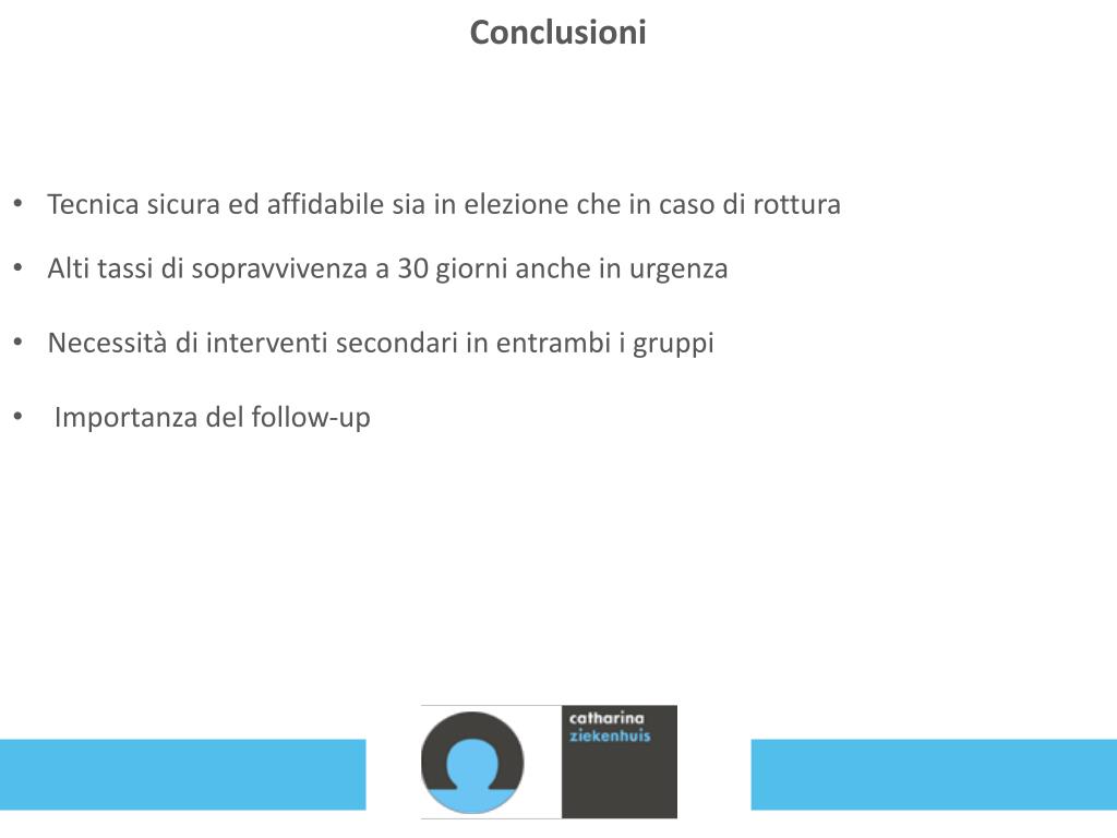 Conclusioni • Tecnica sicura ed affidabile sia in elezione che in caso di rottura • Alti tassi di sopravvivenza a 30 giorni anche in urgenza • Necessità di interventi secondari in entrambi i gruppi • Importanza del follow-up