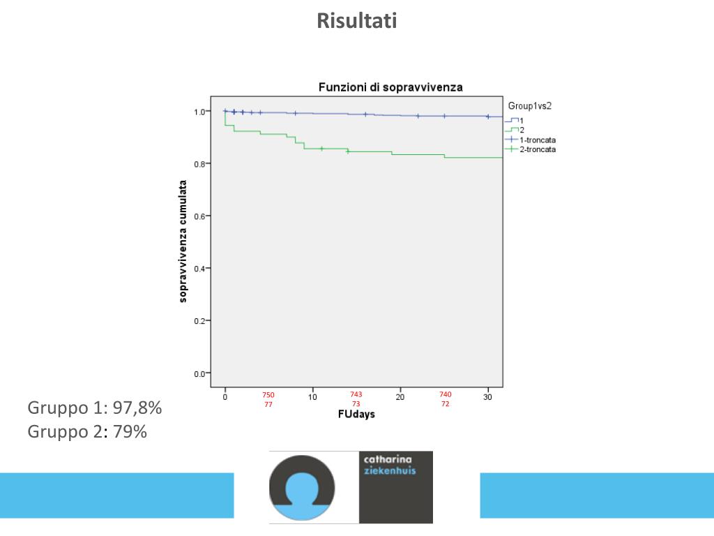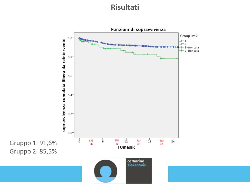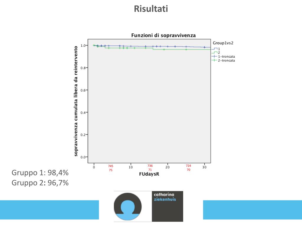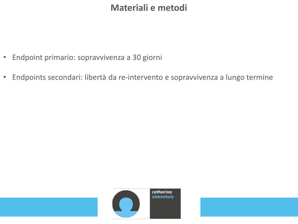 Materiali e metodi • Endpoint primario: sopravvivenza a 30 giorni • Endpoints secondari: libertà da re-intervento e sopravvivenza a lungo termine