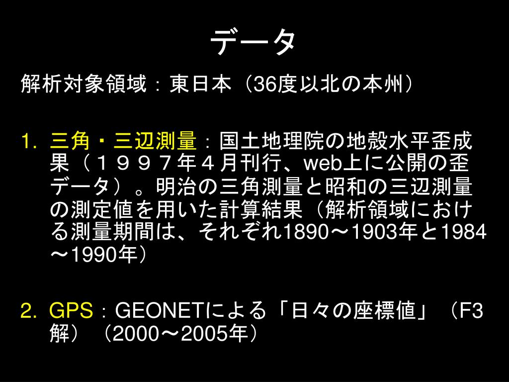 データ 解析対象領域:東日本(36度以北の本州) • 三角・三辺測量:国土地理院の地殻水平歪成果(1997年4月刊行、web上に公開の歪データ)。明治の三角測量と昭和の三辺測量の測定値を用いた計算結果(解析領域における測量期間は、それぞれ1890〜1903年と1984〜1990年) • GPS:GEONETによる「日々の座標値」(F3解)(2000〜2005年)