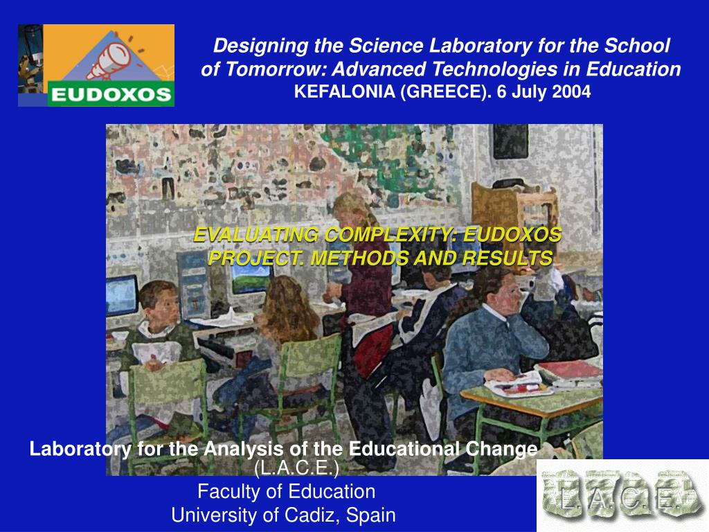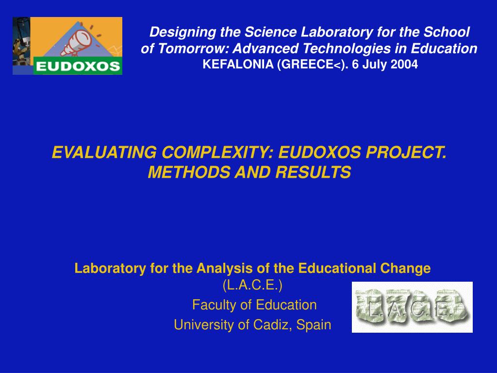 Designing the Science Laboratory for the School of Tomorrow: Advanced Technologies in Education KEFALONIA (GREECE<). 6 July 2004 EVALUATING COMPLEXITY: EUDOXOS PROJECT. METHODS AND RESULTS Laboratory for the Analysis of the Educational Change (L.A.C.E.) Faculty of Education University of Cadiz, Spain