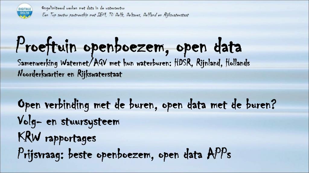 Proeftuin openboezem, open data Samenwerking Waternet/AGV met hun waterburen: HDSR, Rijnland, Hollands Noorderkwartier en Rijkswaterstaat Open verbinding met de buren, open data met de buren? Volg- en stuursysteem KRW rapportages Prijsvraag: beste openboezem, open data APPs