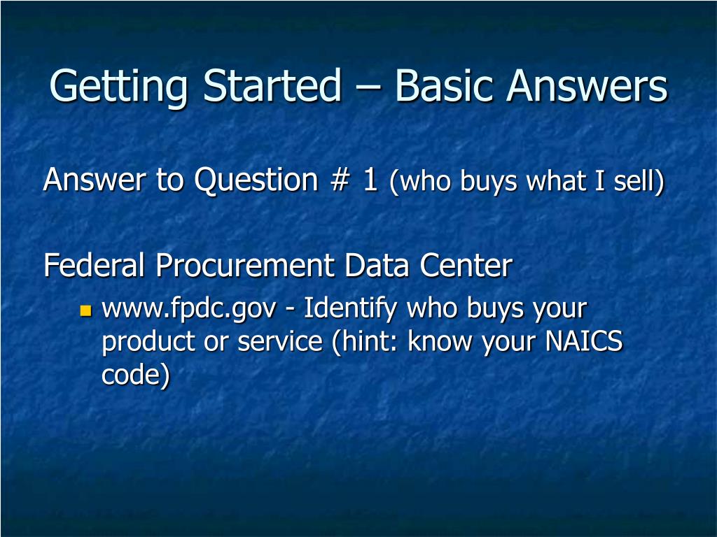 Getting Started – Basic Answers Answer to Question # 1 (who buys what I sell) Federal Procurement Data Center • www.fpdc.gov - Identify who buys your product or service (hint: know your NAICS code)