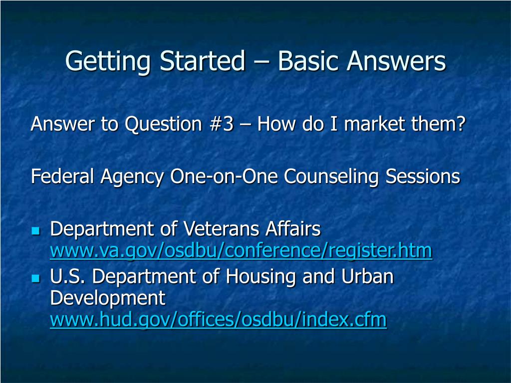Getting Started – Basic Answers Answer to Question #3 – How do I market them? Federal Agency One-on-One Counseling Sessions • Department of Veterans Affairswww.va.gov/osdbu/conference/register.htm • U.S. Department of Housing and Urban Development www.hud.gov/offices/osdbu/index.cfm