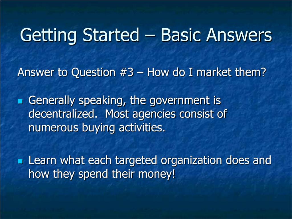 Getting Started – Basic Answers Answer to Question #3 – How do I market them? • Generally speaking, the government is decentralized. Most agencies consist of numerous buying activities. • Learn what each targeted organization does and how they spend their money!