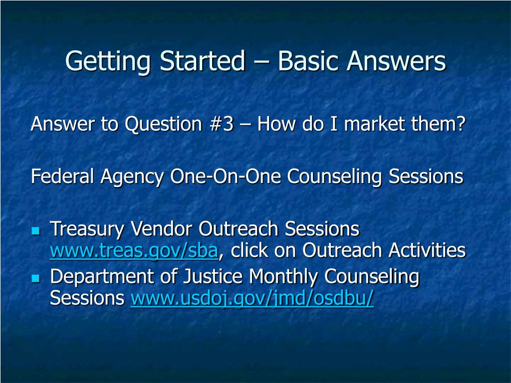 Getting Started – Basic Answers Answer to Question #3 – How do I market them? Federal Agency One-On-One Counseling Sessions • Treasury Vendor Outreach Sessions www.treas.gov/sba, click on Outreach Activities • Department of Justice Monthly Counseling Sessions www.usdoj.gov/jmd/osdbu/