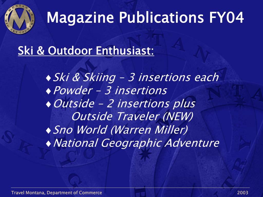 Magazine Publications FY04 Ski & Outdoor Enthusiast: Ski & Skiing – 3 insertions each Powder – 3 insertions Outside – 2 insertions plus Outside Traveler (NEW) Sno World (Warren Miller) National Geographic Adventure Travel Montana, Department of Commerce 2003