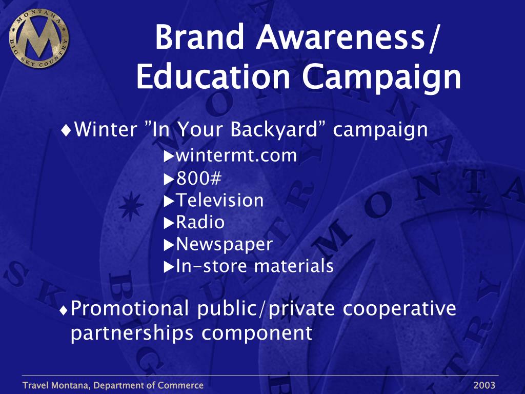 Brand Awareness/ Education Campaign Winter ”In Your Backyard” campaign wintermt.com 800# Television Radio Newspaper In-store materials Promotional public/private cooperative partnerships component Travel Montana, Department of Commerce 2003