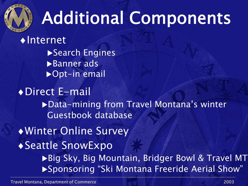 Additional Components Internet Search Engines Banner ads Opt-in email Direct E-mail Data-mining from Travel Montana’s winter Guestbook database Winter Online Survey Seattle SnowExpo Big Sky, Big Mountain, Bridger Bowl & Travel MT Sponsoring “Ski Montana Freeride Aerial Show” Travel Montana, Department of Commerce 2003