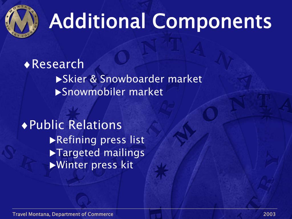 Additional Components Research Skier & Snowboarder market Snowmobiler market Public Relations Refining press list Targeted mailings Winter press kit Travel Montana, Department of Commerce 2003