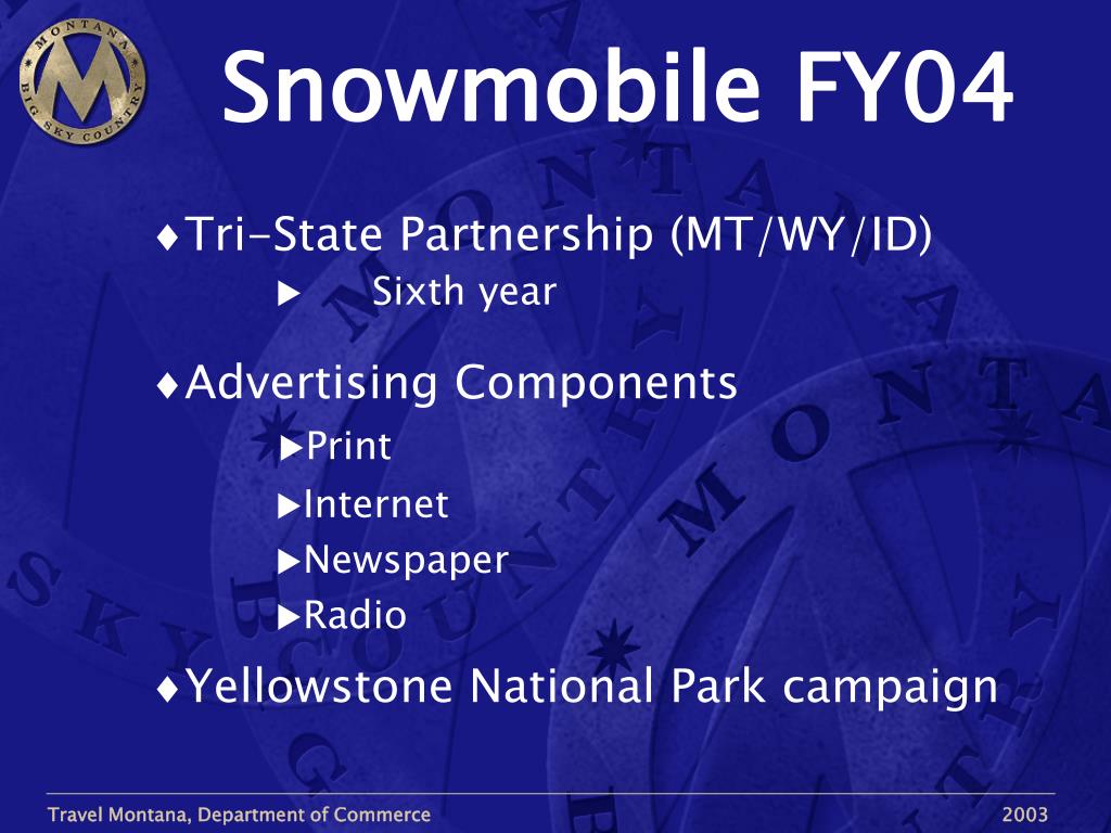 Snowmobile FY04 Tri-State Partnership (MT/WY/ID) Sixth year Advertising Components Print Internet Newspaper Radio Yellowstone National Park campaign Travel Montana, Department of Commerce 2003