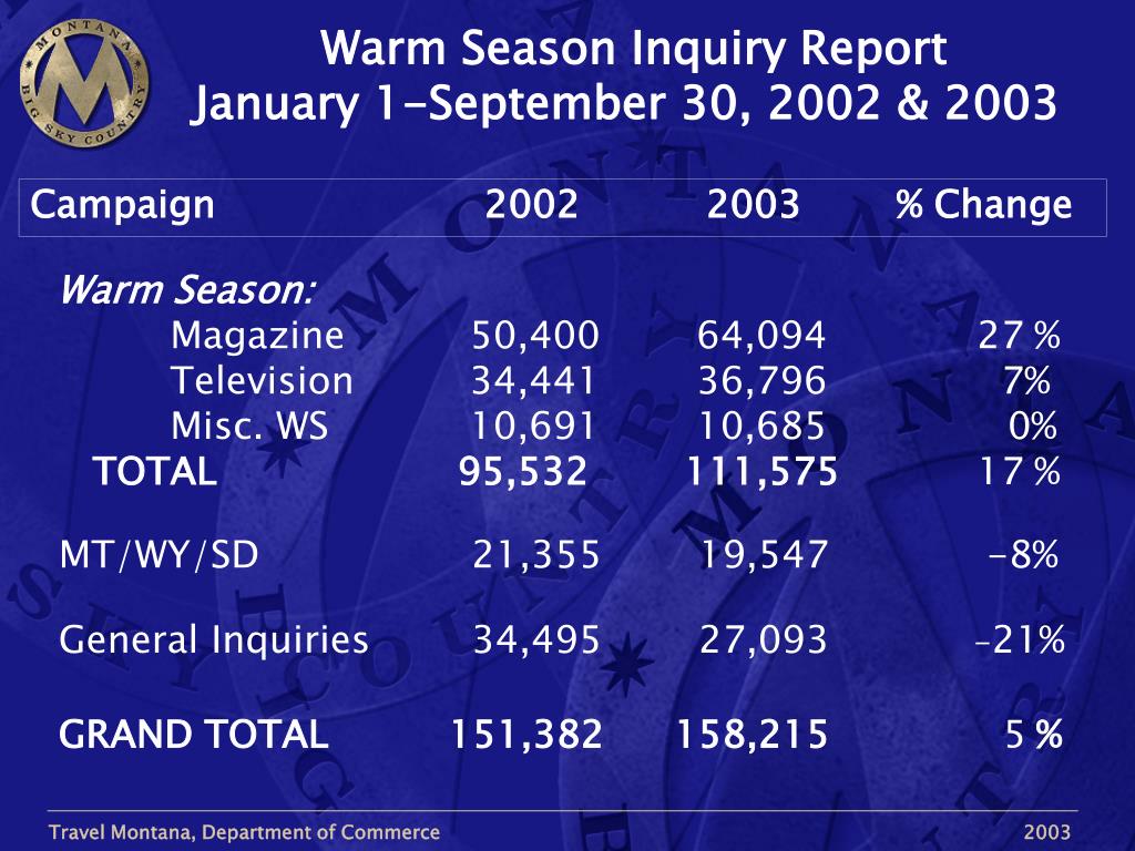 Warm Season Inquiry Report January 1-September 30, 2002 & 2003 Campaign 2002 2003 % Change Warm Season: Magazine 50,400 64,094 27% Television 34,441 36,796 7% Misc. WS 10,691 10,685 0% TOTAL 95,532 111,575 17% MT/WY/SD 21,355 19,547 -8% General Inquiries 34,495 27,093 -21% GRAND TOTAL151,382 158,215 5% Travel Montana, Department of Commerce 2003