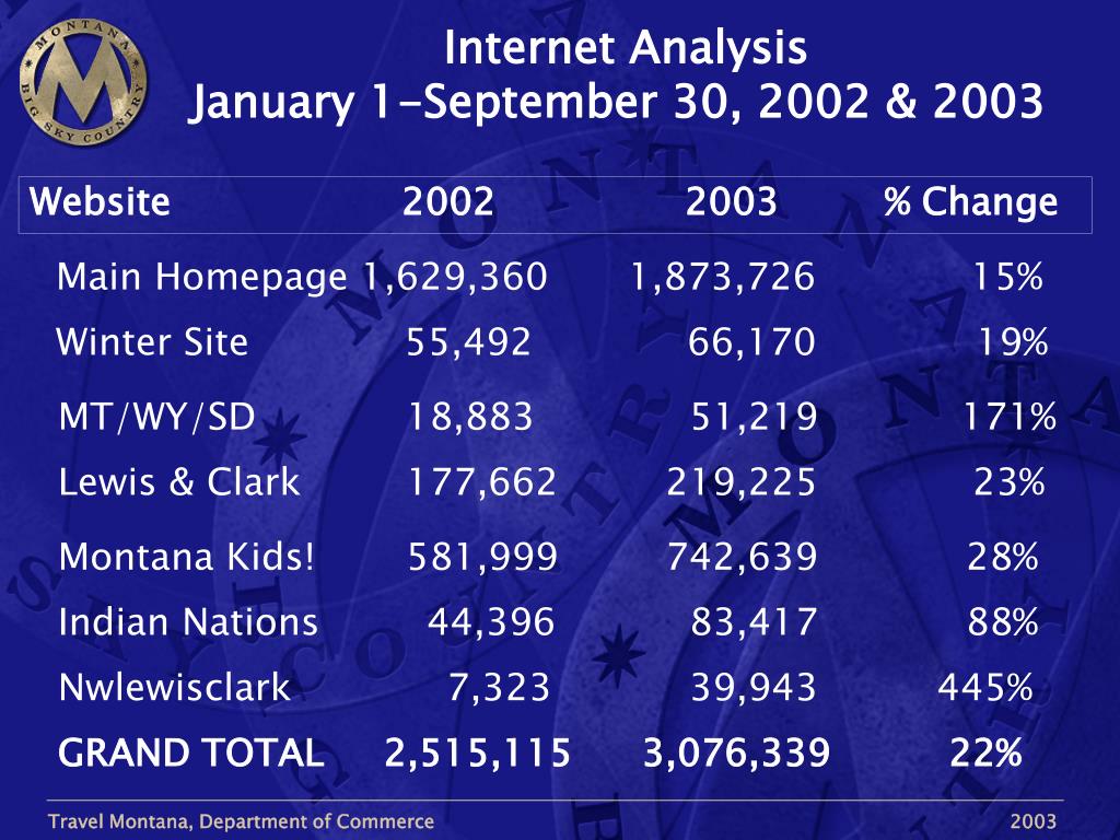 Internet Analysis January 1-September 30, 2002 & 2003 Website 2002 2003 % Change Main Homepage 1,629,360 1,873,726 15% Winter Site 55,492 66,170 19% MT/WY/SD 18,883 51,219 171% Lewis & Clark 177,662 219,225 23% Montana Kids! 581,999 742,639 28% Indian Nations 44,396 83,417 88% Nwlewisclark 7,323 39,943 445% GRAND TOTAL2,515,115 3,076,339 22% Travel Montana, Department of Commerce 2003