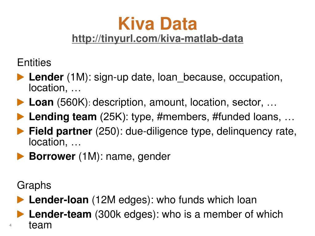 Kiva Datahttp://tinyurl.com/kiva-matlab-data Entities • Lender (1M): sign-up date, loan_because, occupation, location, … • Loan(560K): description, amount, location, sector, … • Lending team (25K): type, #members, #funded loans, … • Field partner (250): due-diligence type, delinquency rate, location, … • Borrower (1M): name, gender Graphs • Lender-loan (12M edges): who funds which loan • Lender-team (300k edges): who is a member of which team 4