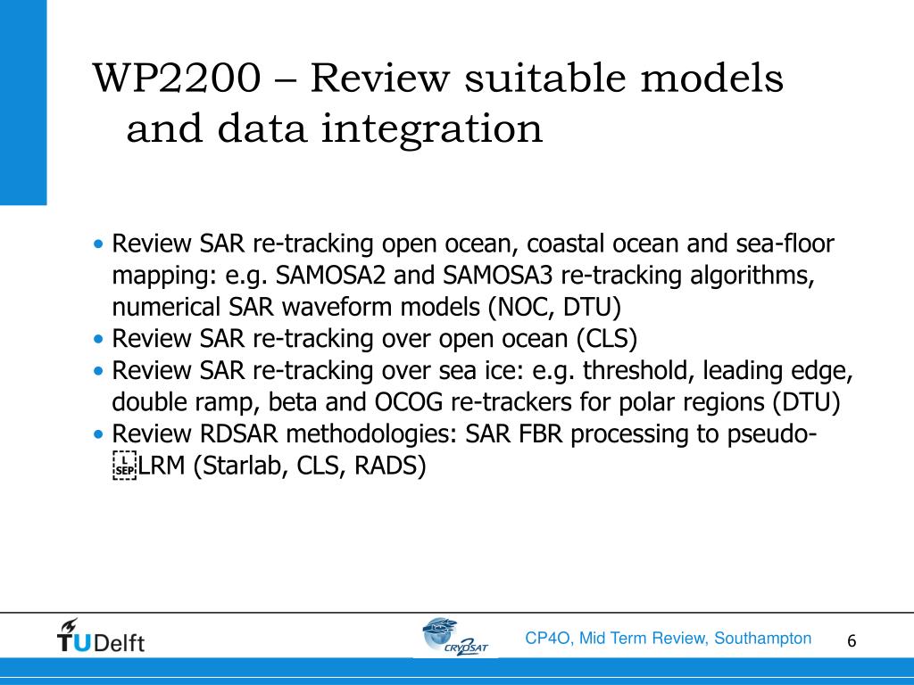Overview of work package WP2000:state of the art analysis • Timing: positioned between WP1000 and WP3000 • Involved: NOC, CLS, DTU-Space, STARLAB, isardSAT, Noveltis,U Porto, SatOC, and TUDelft (WP leader) • Objective: review all existing CryoSat-2 products and availability, review all suitable models for re-tracking and data integration approaches, and survey auxiliary data sources to help the development and validation of CryoSat+ ocean products, survey upcoming activities that could support CryoSat-2, and choose suitable test areas for validation purposes. • Deliverables: Preliminary Analysis Report (PAR) and the Development Validation Plan (DVP) • Quality control: draft review by CP4O team and steering group
