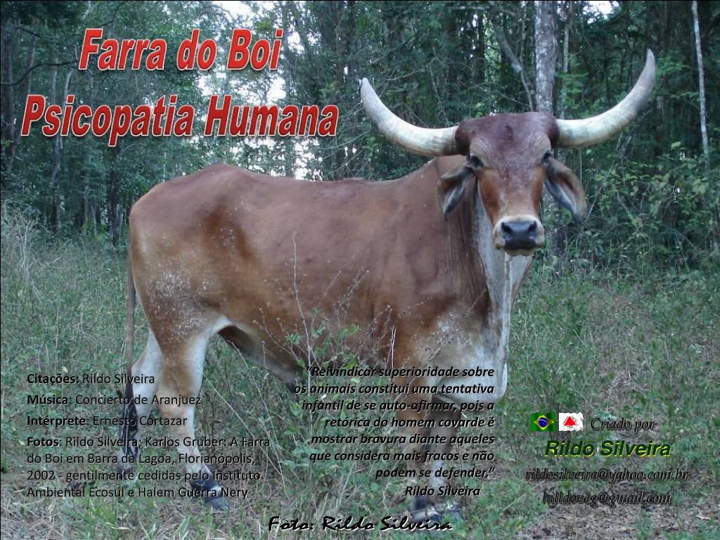 “Reivindicar superioridade sobre os animais constitui uma tentativa infantil de se auto-afirmar, pois a retórica do homem covarde é mostrar bravura diante aqueles que considera mais fracos e não podem se defender.” Criado por rildosilveira@yahoo.com.br hilldoveg@gmail.com Rildo Silveira Foto: Rildo Silveira Citações: Rildo Silveira Música: Concierto de Aranjuez Intérprete: Ernesto Cortazar Fotos: Rildo Silveira; Karlos Gruber: A Farra do Boi em Barra da Lagoa, Florianópolis, 2002 - gentilmente cedidas pelo Instituto Ambiental Ecosul e Halem Guerra Nery • Rildo Silveira