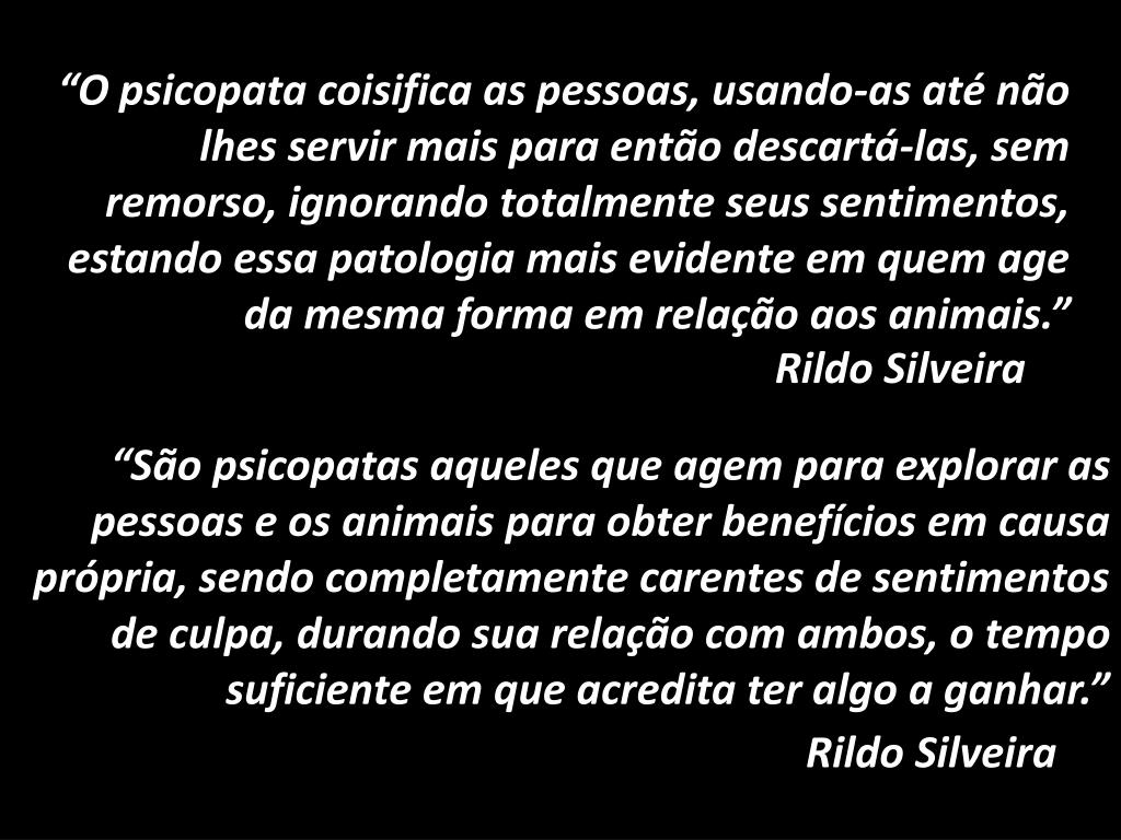 “O psicopata coisifica as pessoas, usando-as até não lhes servir mais para então descartá-las, sem remorso, ignorando totalmente seus sentimentos, estando essa patologia mais evidente em quem age da mesma forma em relação aos animais.” Rildo Silveira “São psicopatas aqueles que agem para explorar as pessoas e os animais para obter benefícios em causa própria, sendo completamente carentes de sentimentos de culpa, durando sua relação com ambos, o tempo suficiente em que acredita ter algo a ganhar.” Rildo Silveira