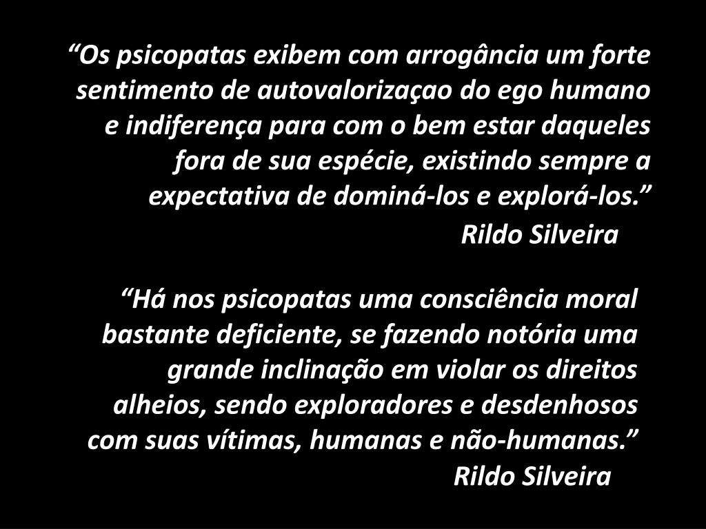 “Os psicopatas exibem com arrogância um forte sentimento de autovalorizaçao do ego humano e indiferença para com o bem estar daqueles fora de sua espécie, existindo sempre a expectativa de dominá-los e explorá-los.” Rildo Silveira “Há nos psicopatas uma consciência moral bastante deficiente, se fazendo notória uma grande inclinação em violar os direitos alheios, sendo exploradores e desdenhosos com suas vítimas, humanas e não-humanas.” Rildo Silveira