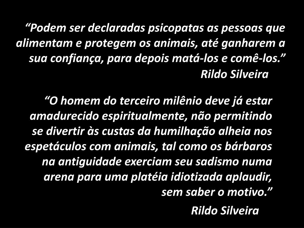 “Podem ser declaradas psicopatas as pessoas que alimentam e protegem os animais, até ganharem a sua confiança, para depois matá-los e comê-los.” “O homem do terceiro milênio deve já estar amadurecido espiritualmente, não permitindo se divertir às custas da humilhação alheia nos espetáculos com animais, tal como os bárbaros na antiguidade exerciam seu sadismo numa arena para uma platéia idiotizada aplaudir, sem saber o motivo.” Rildo Silveira Rildo Silveira