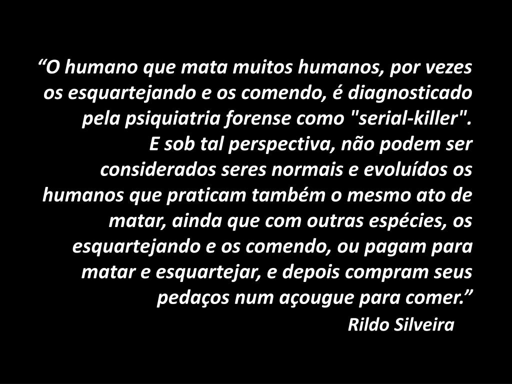 “O humano que mata muitos humanos, por vezes os esquartejando e os comendo, é diagnosticado pela psiquiatria forense como "serial-killer". E sob tal perspectiva, não podem ser considerados seres normais e evoluídos os humanos que praticam também o mesmo ato de matar, ainda que com outras espécies, os esquartejando e os comendo, ou pagam para matar e esquartejar, e depois compram seus pedaços num açougue para comer.” Rildo Silveira