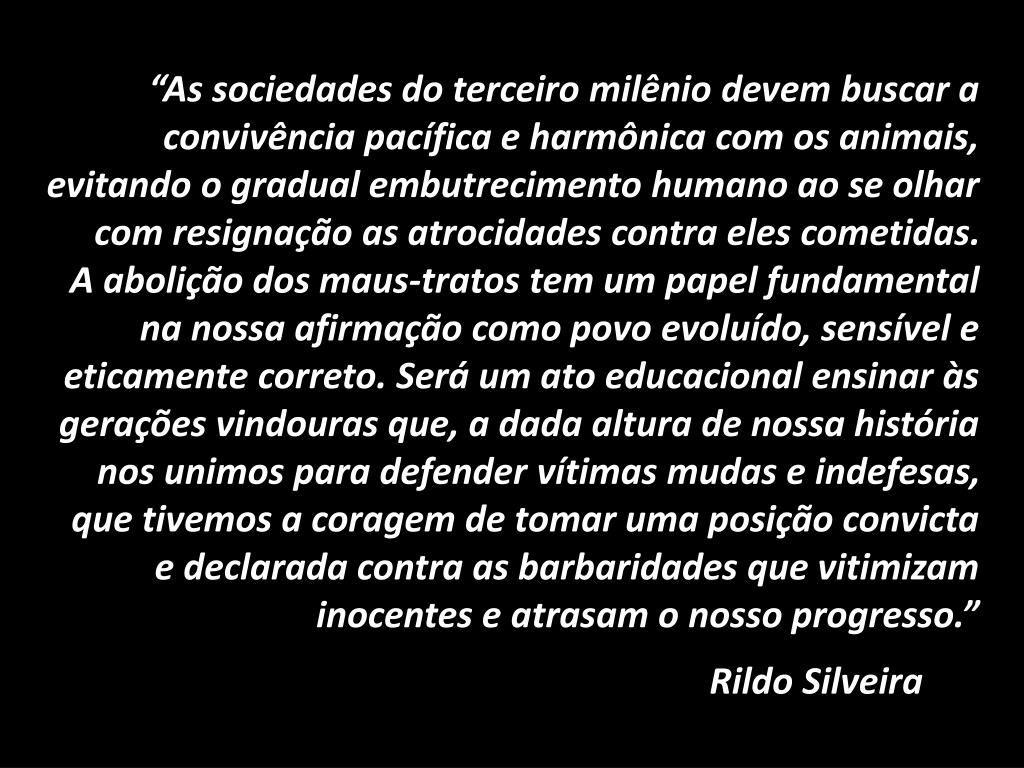 “As sociedades do terceiro milênio devem buscar a convivência pacífica e harmônica com os animais, evitando o gradual embutrecimento humano ao se olhar com resignação as atrocidades contra eles cometidas. A abolição dos maus-tratos tem um papel fundamental na nossa afirmação como povo evoluído, sensível e eticamente correto. Será um ato educacional ensinar às gerações vindouras que, a dada altura de nossa história nos unimos para defender vítimas mudas e indefesas, que tivemos a coragem de tomar uma posição convicta e declarada contra as barbaridades que vitimizam inocentes e atrasam o nosso progresso.” Rildo Silveira
