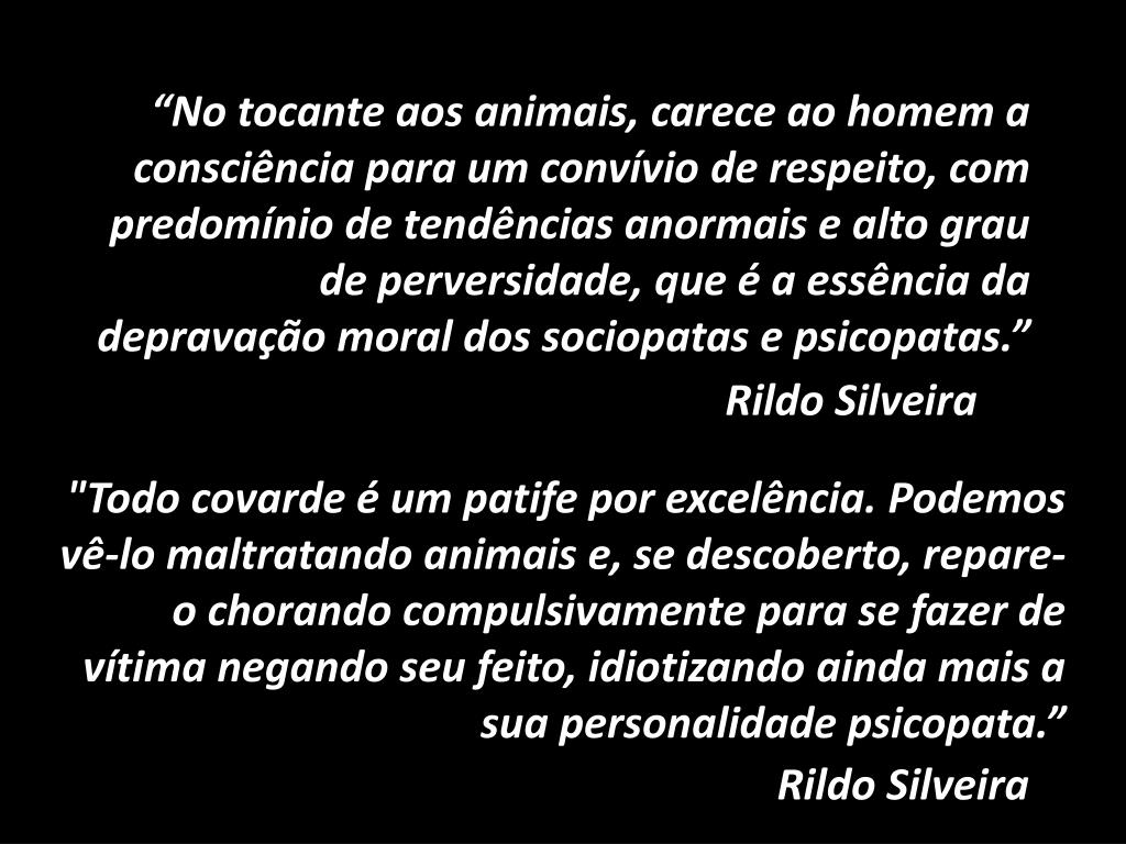 “No tocante aos animais, carece ao homem a consciência para um convívio de respeito, com predomínio de tendências anormais e alto grau de perversidade, que é a essência da depravação moral dos sociopatas e psicopatas.” "Todo covarde é um patife por excelência. Podemos vê-lo maltratando animais e, se descoberto, repare-o chorando compulsivamente para se fazer de vítima negando seu feito, idiotizando ainda mais a sua personalidade psicopata.” Rildo Silveira Rildo Silveira