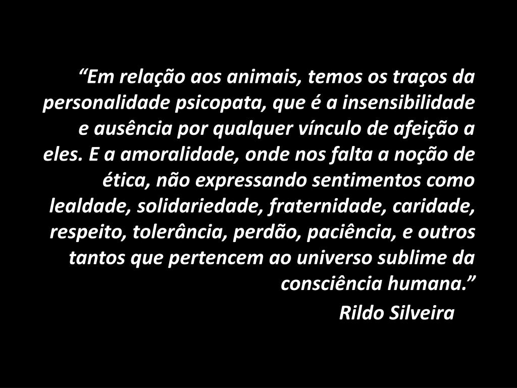 “Em relação aos animais, temos os traços da personalidade psicopata, que é a insensibilidade e ausência por qualquer vínculo de afeição a eles. E a amoralidade, onde nos falta a noção de ética, não expressando sentimentos como lealdade, solidariedade, fraternidade, caridade, respeito, tolerância, perdão, paciência, e outros tantos que pertencem ao universo sublime da consciência humana.” Rildo Silveira