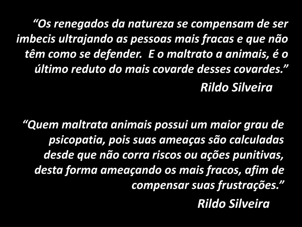 “Os renegados da natureza se compensam de ser imbecis ultrajando as pessoas mais fracas e que não têm como se defender. E o maltrato a animais, é o último reduto do mais covarde desses covardes.” Rildo Silveira “Quem maltrata animais possui um maior grau de psicopatia, pois suas ameaças são calculadas desde que não corra riscos ou ações punitivas, desta forma ameaçando os mais fracos, afim de compensar suas frustrações.” Rildo Silveira