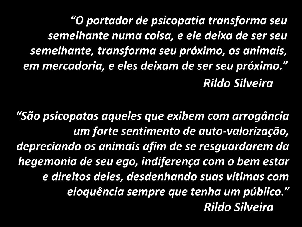 “O portador de psicopatia transforma seu semelhante numa coisa, e ele deixa de ser seu semelhante, transforma seu próximo, os animais, em mercadoria, e eles deixam de ser seu próximo.” Rildo Silveira “São psicopatas aqueles que exibem com arrogância um forte sentimento de auto-valorização, depreciando os animais afim de se resguardarem da hegemonia de seu ego, indiferença com o bem estar e direitos deles, desdenhando suas vítimas com eloquência sempre que tenha um público.” Rildo Silveira