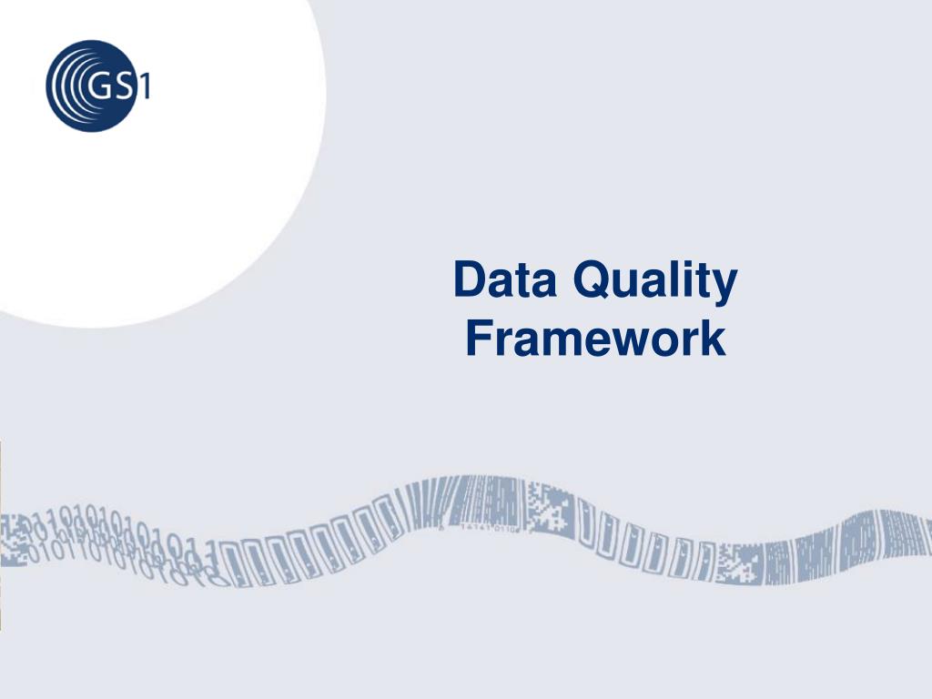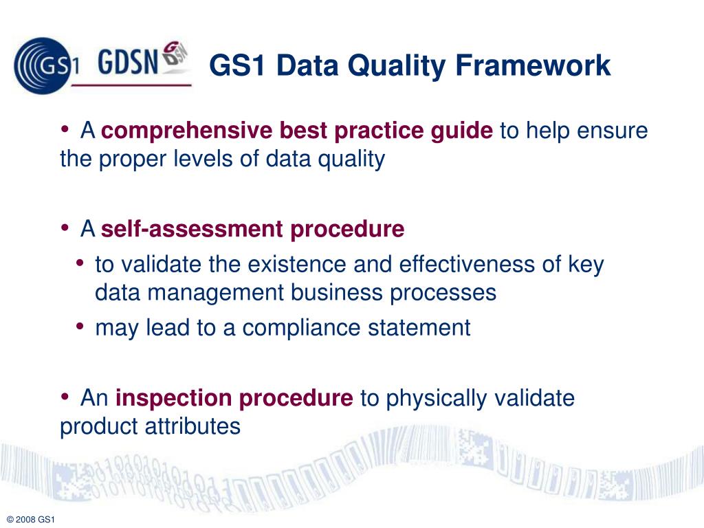 GS1 Data Quality Framework • A comprehensive best practice guide to help ensure the proper levels of data quality • A self-assessment procedure • to validate the existence and effectiveness of key data management business processes • may lead to a compliance statement • An inspection procedure to physically validate product attributes