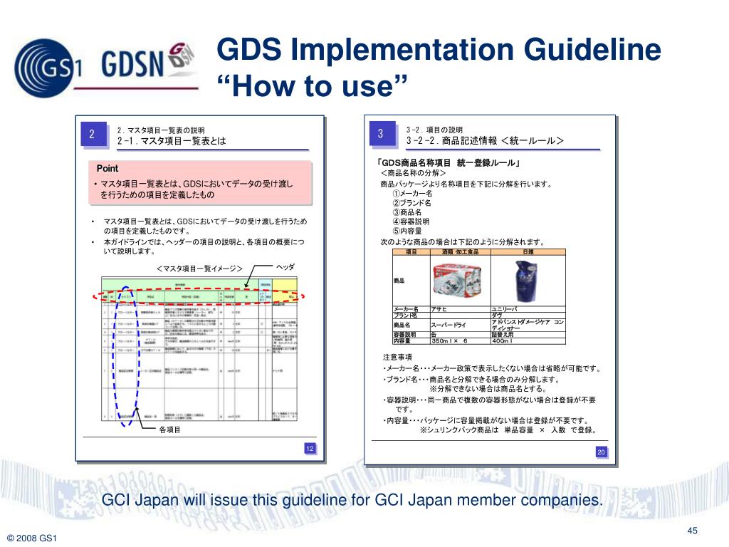 GDS Implementation Guideline “How to use” GCI Japan will issue this guideline for GCI Japan member companies.