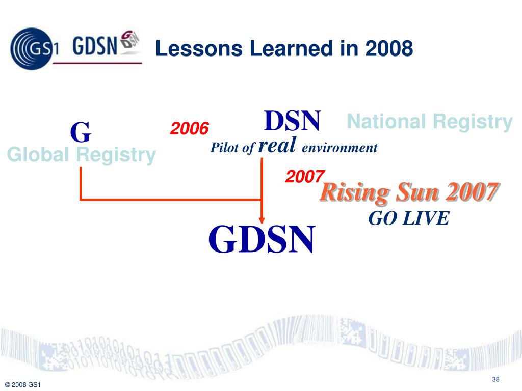 G 2006 2007 2008 Rising Sun 2007 Pilot ofreal environment Many things to do for more implementation GO LIVE Global Registry Lessons Learned in 2008 DSN National Registry GDSN