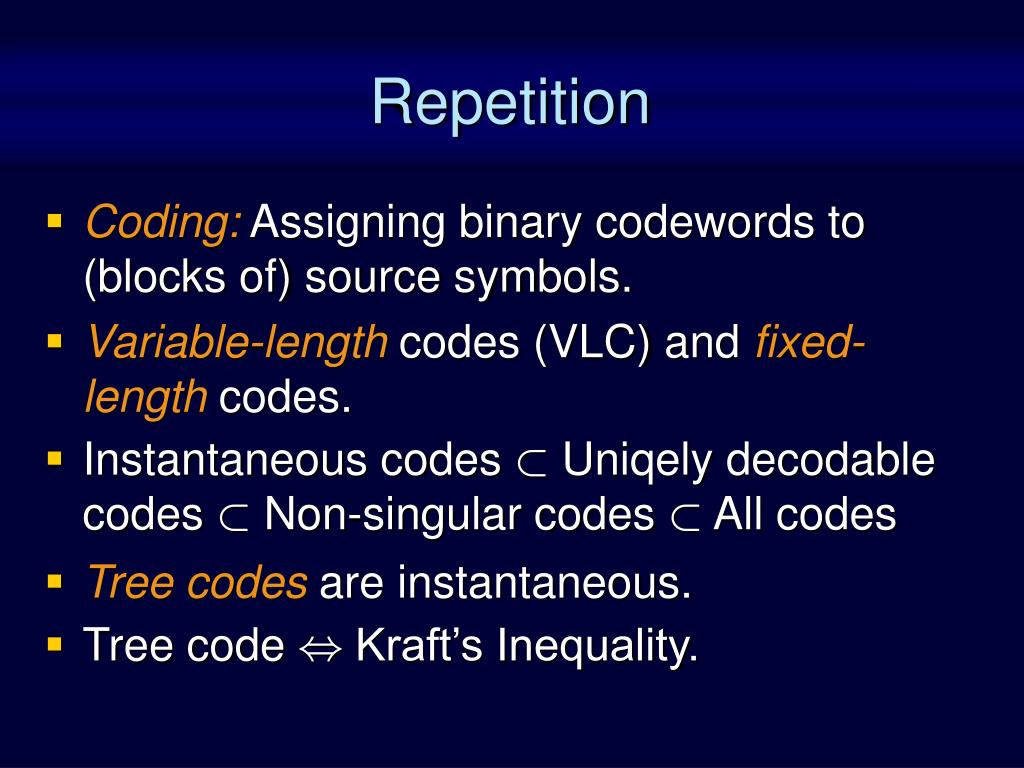 Repetition • Coding: Assigning binary codewords to (blocks of) source symbols. • Variable-length codes (VLC) and fixed-length codes. • Instantaneous codes ½ Uniqely decodable codes ½ Non-singular codes ½ All codes • Tree codes are instantaneous. • Tree code , Kraft’s Inequality.