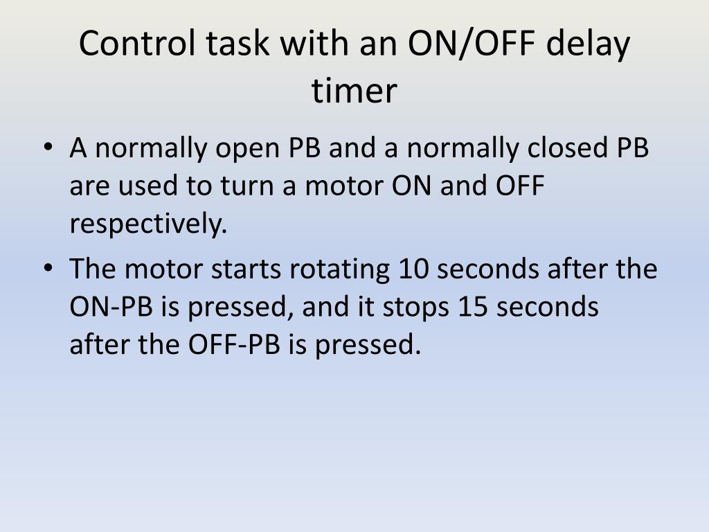 Control task with an ON/OFF delay timer • A normally open PB and a normally closed PB are used to turn a motor ON and OFF respectively. • The motor starts rotating 10 seconds after the ON-PB is pressed, and it stops 15 seconds after the OFF-PB is pressed.