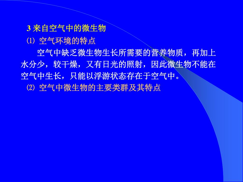 3 来自空气中的微生物 ⑴ 空气环境的特点 空气中缺乏微生物生长所需要的营养物质,再加上水分少,较干燥,又有日光的照射,因此微生物不能在空气中生长,只能以浮游状态存在于空气中。 ⑵ 空气中微生物的主要类群及其特点