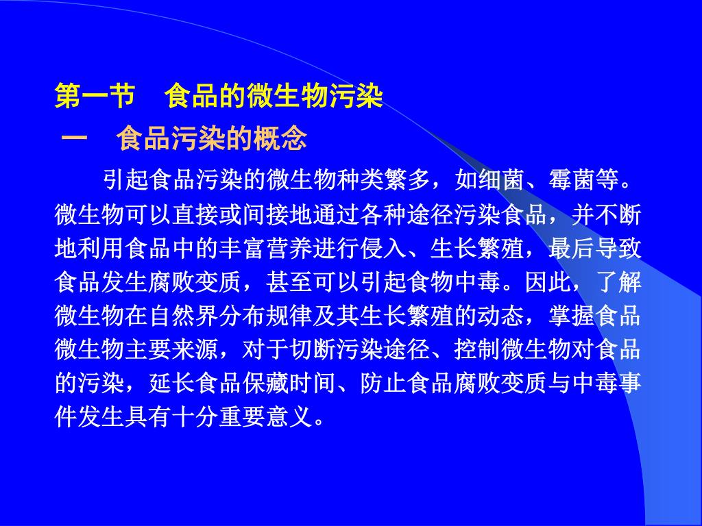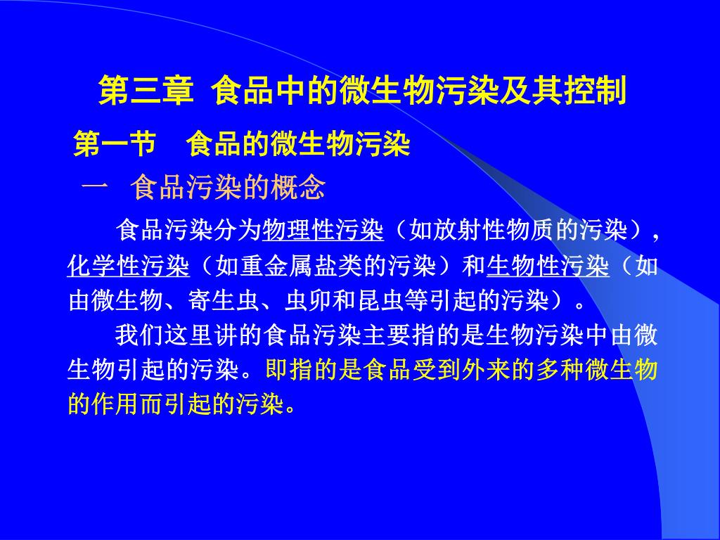 第三章 食品中的微生物污染及其控制 第一节 食品的微生物污染 一 食品污染的概念 二 污染食品的微生物来源 三 微生物污染食品的途径 第二节 微生物污染食品的控制 一 食品中微生物的消长 二 食品微生物污染的控制