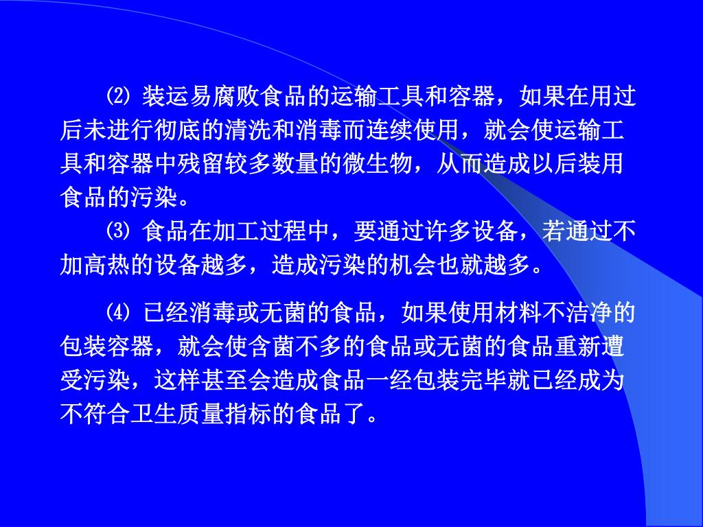 ⑵ 装运易腐败食品的运输工具和容器,如果在用过后未进行彻底的清洗和消毒而连续使用,就会使运输工具和容器中残留较多数量的微生物,从而造成以后装用食品的污染。 ⑶ 食品在加工过程中,要通过许多设备,若通过不加高热的设备越多,造成污染的机会也就越多。 ⑷ 已经消毒或无菌的食品,如果使用材料不洁净的包装容器,就会使含菌不多的食品或无菌的食品重新遭受污染,这样甚至会造成食品一经包装完毕就已经成为不符合卫生质量指标的食品了。
