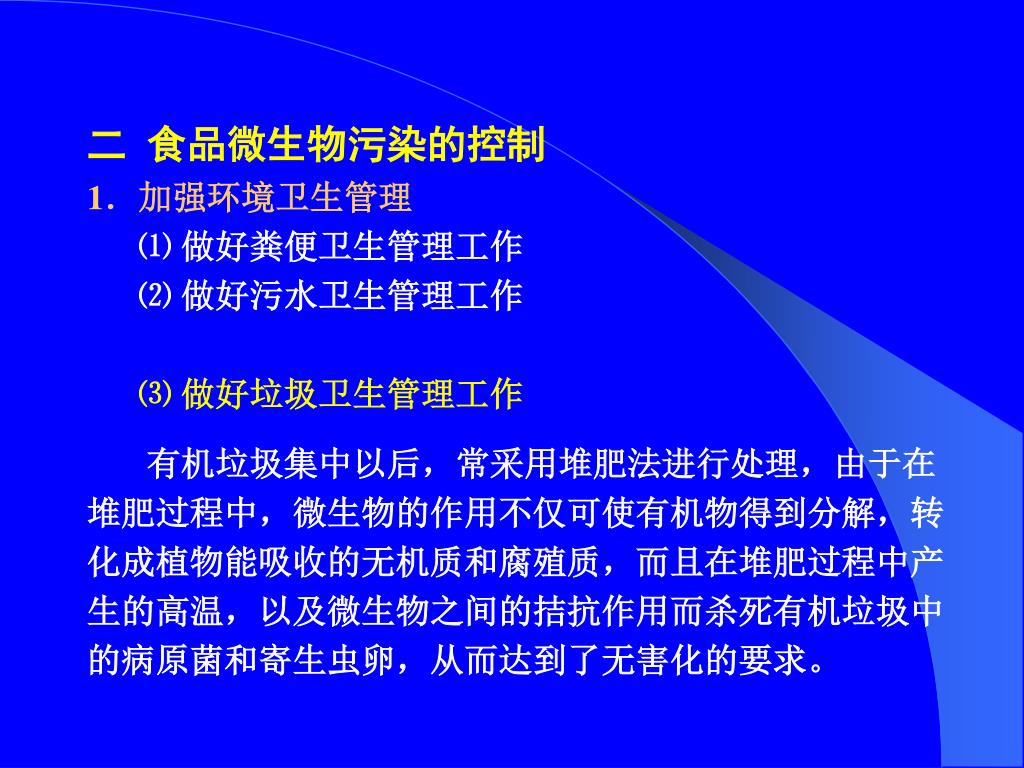 二 食品微生物污染的控制 1.加强环境卫生管理 ⑴ 做好粪便卫生管理工作 ⑵ 做好污水卫生管理工作 ⑶ 做好垃圾卫生管理工作 有机垃圾集中以后,常采用堆肥法进行处理,由于在堆肥过程中,微生物的作用不仅可使有机物得到分解,转化成植物能吸收的无机质和腐殖质,而且在堆肥过程中产生的高温,以及微生物之间的拮抗作用而杀死有机垃圾中的病原菌和寄生虫卵,从而达到了无害化的要求。
