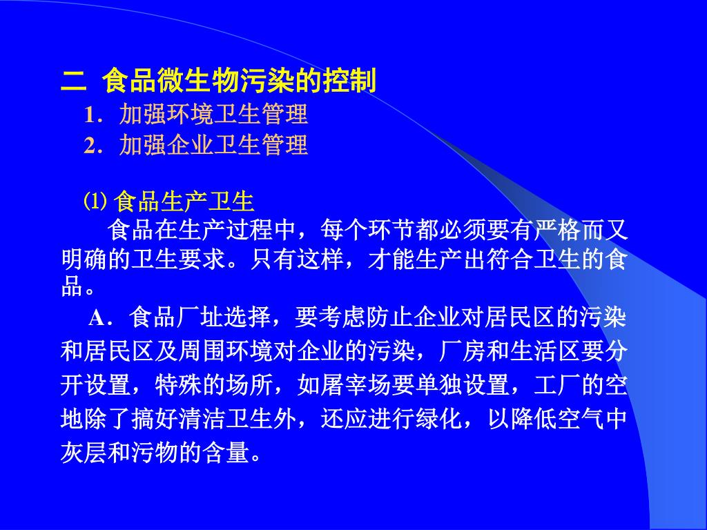二 食品微生物污染的控制 1.加强环境卫生管理 2.加强企业卫生管理 ⑴ 食品生产卫生 食品在生产过程中,每个环节都必须要有严格而又明确的卫生要求。只有这样,才能生产出符合卫生的食品。 A.食品厂址选择,要考虑防止企业对居民区的污染和居民区及周围环境对企业的污染,厂房和生活区要分开设置,特殊的场所,如屠宰场要单独设置,工厂的空地除了搞好清洁卫生外,还应进行绿化,以降低空气中灰层和污物的含量。