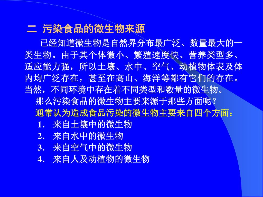 二 污染食品的微生物来源 已经知道微生物是自然界分布最广泛、数量最大的一类生物。由于其个体微小、繁殖速度快、营养类型多、适应能力强,所以土壤、水中、空气、动植物体表及体内均广泛存在,甚至在高山、海洋等都有它们的存在。当然,不同环境中存在着不同类型和数量的微生物。 那么污染食品的微生物主要来源于那些方面呢? 通常认为造成食品污染的微生物主要来自四个方面: 1. 来自土壤中的微生物 2. 来自水中的微生物 3. 来自空气中的微生物 4. 来自人及动植物的微生物